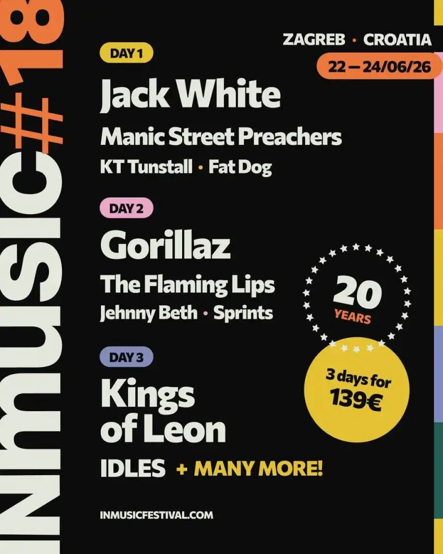 В 2026 году он отмечает 20-летие и вновь собирает мощный мультижанровый лайн-ап. Среди заявленных артистов — Gorillaz, Kings of Leon, IDLES, The Flaming Lips, Manic Street Preachers, Jehnny Beth, KT Tunstall, Yonaka, Dry Cleaning и другие. Одним из главных хедлайнеров станет Jack White — легендарный лидер The White Stripes и один из самых влиятельных рок-музыкантов последних десятилетий. Его выступление в Загребе станет одним из концертов его небольшого европейского тура этим летом и одновременно дебютным сольным выступлением артиста в Хорватии.